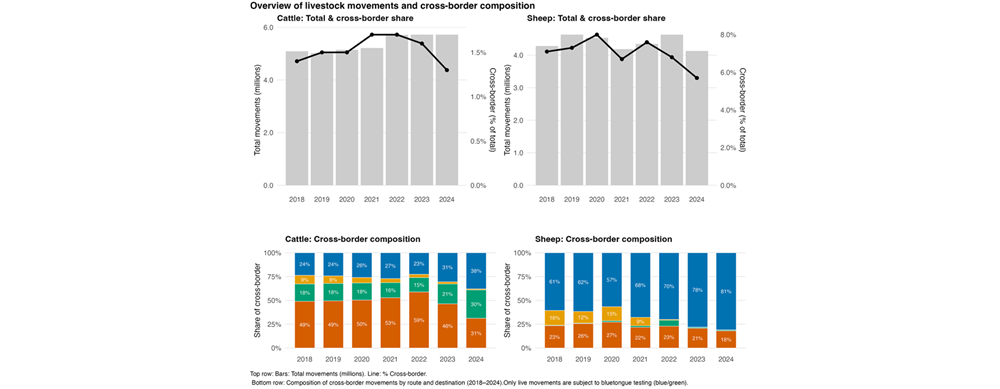 Figure 1. Top panels show total annual livestock movements (millions; grey bars, left axis) and the proportion of movements that are cross-border into Scotland (black line, right axis) for cattle (left) and sheep (right). Note that cross-border movements represent a small proportion of total movements, particularly for cattle. Bottom panels show the composition of cross-border movements by route and destination, including movements to live via markets (blue), direct to live (green), and movements direct to slaughter (orange) or via a market to slaughter (yellow). Only live cross-border movements (blue and green) would potentially be subject to testing.